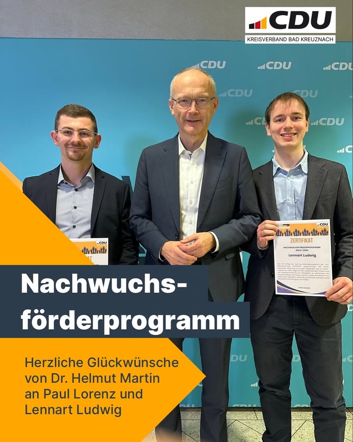 #Nachwuchsförderung: Herzlichen Glückwunsch, Paul & Lennart! 🎉🙌 Der CDU-Kreisverband Bad Kreuznach gratuliert herzlich unseren beiden Absolventen des Nachwuchsförderprogramms der @cdurlp, Paul Lorenz und Lennart Ludwig! Im vergangenen Jahr hattet ihr die Möglichkeit, an vielfältigen Seminaren teilzunehmen, euer Know-how auszubauen […]